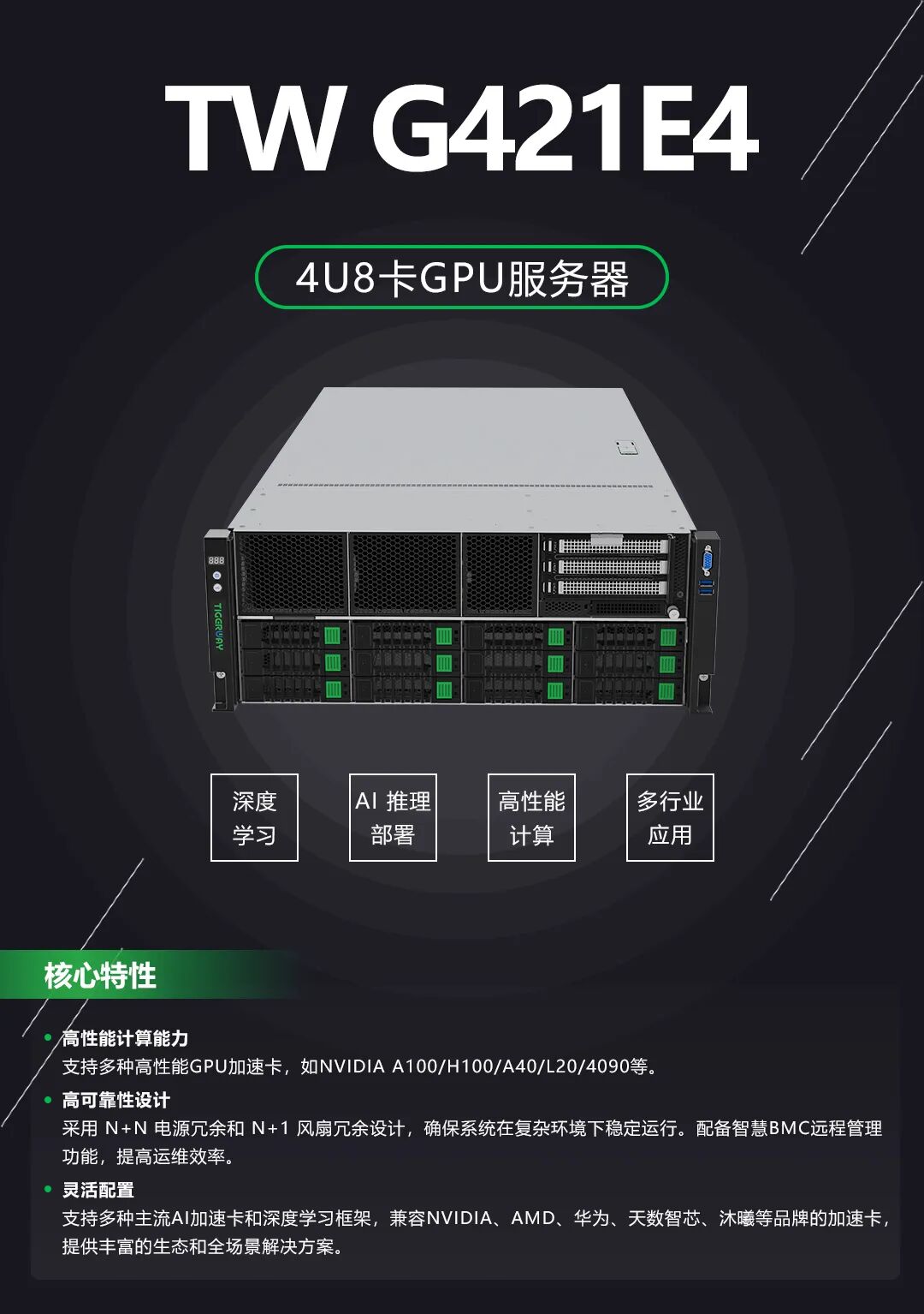 无论是大型模型的快速迭代,还是科研、金融、教育、工业仿真等场景,TW G421E4都能提供坚实的算力支撑。