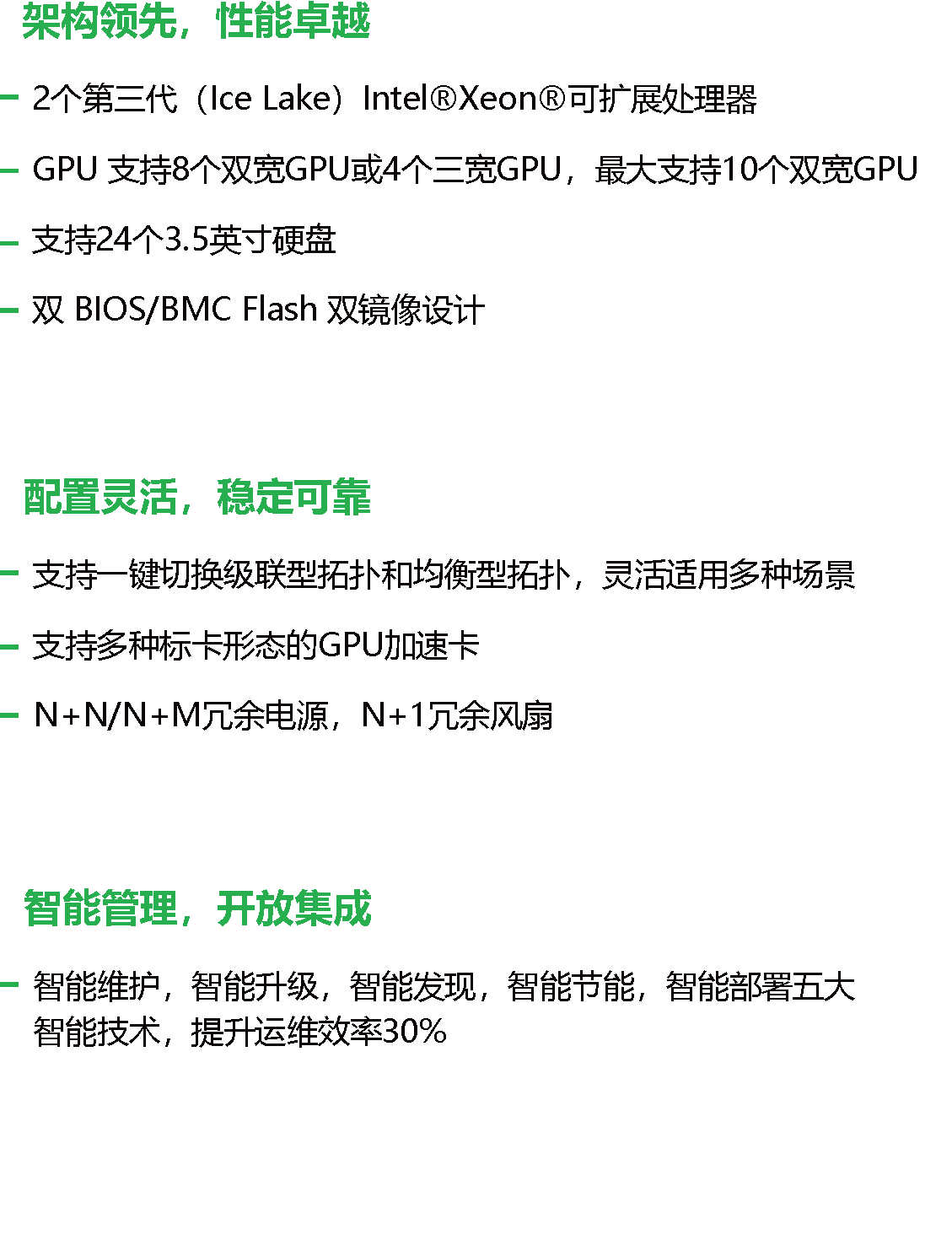 | 管理 | BMC芯片集成1个专用管理GE网口,提供全面的故障诊断、自动化运维、硬件安全加固等管理特性,支持双 BIOS/BMC Flash 双镜像 |